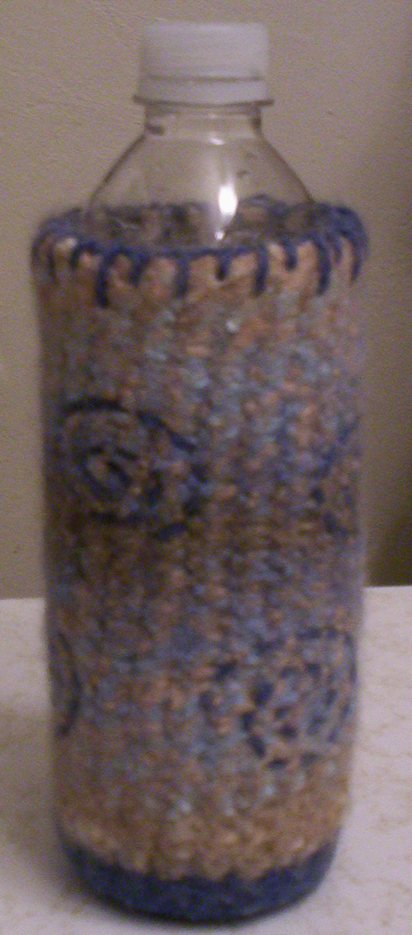 anyway (yuck!), I should go ahead and felt my Bottle Hug. This time around I used Patons SWS, with some contrasting Lion Brand Felting Wool at the bottom. When it was felted, the varigated color of the SWS yarn lost it’s pretty luster that it had originally, (it was really pretty boring!) so I decided to use the contrasting yarn and a strong tapestry needle to chain stitch some swirlies into the hug. A row of alternating lengths of blanket stitches completed the design and Wah-Lah! Just what it needed! Lesson learned: Never be afraid of changing something up & making it yours! 🙂