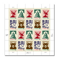 Inspired by traditional Norwegian sweaters, the stamps include a stag, a snow-dappled evergreen tree, a snowman sporting a top hat and a whimsical teddy bear.