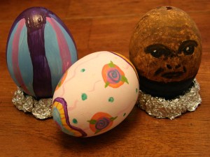 Once the eggs were completely drained, we used a combination of water color and acrylic paints to decorate.