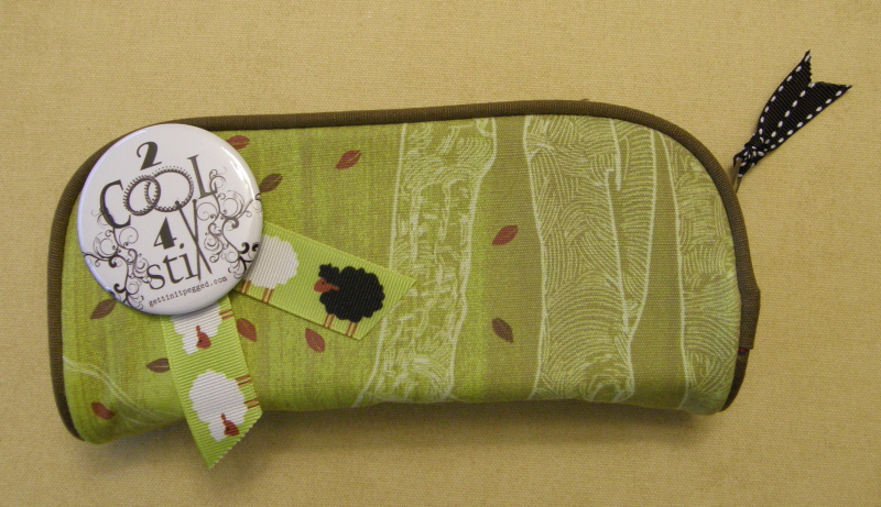 Congratulations, Carol! You are the winner of a super cute tool bag for all your looming and crochet accessories! (‘Cause I know you’re multi-talented that way!) This roomy tool bag sports a 2 1/4″ button with the 2 Cool 4 Stix logo and an adorable ribbon tidbit with little sheep dancing along it’s edge. Love it! 🙂