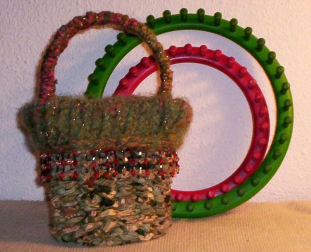 I thought it would be a great time to re-release the “itty bitty bag” pattern that was featured in the Loom Knitter’s Circle Magazine Summer 2010 issue. 🙂