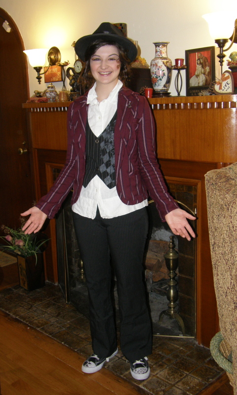 Well…as it turned out, my eldest daughter, Emily, decided to dress up for the Halloween festivities as well…Surprise, surprise! She dove into her closet and found the makings for her own version of the March Hare. She is also going to be attending the Alice in Wonderland birthday party in March and used this as her trial run for her costume. I love that I didn’t have to lift a finger for her ensemble, lol…except to help her touch up the little bit of make up design on her face. Yay! Doesn’t she look cute?!