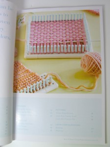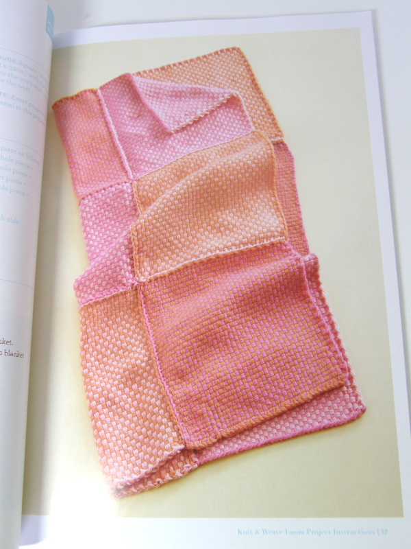 It has some projects: a garter stitch hat, matching scarf and this adorable woven blanket…too cute! I really would love to make this sometime. 🙂