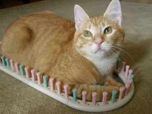 Hahahaha! No…not this kitty, but he sure is cute, isn’t he? 😀 I put the loom in this configuration to create an adult size hat.