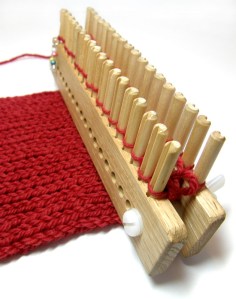 The loom shown here is the Small Gauge ADR 8″ and the Small Gauge 16 peg Round Loom. I love that the ADR loom comes with the ability to change it from a large square, to a smaller, adjustable square (via the shorter loom sections and holes across the length of the loom), as well as a board suitable for double knitting (as is shown in the photo above).