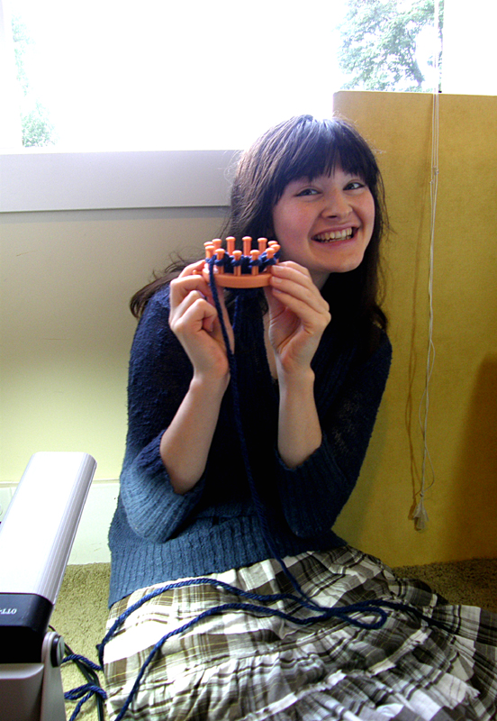 See the colored mat board behind her? This is where all the props get stacked and stored until I’m ready to use them again. It’s simple, easy and takes up no horizontal space in the room. The table we’re using as a set up for the photo props is just to the right of her as you look straight on (you can see it’s shadow on the yellow mat board). It’s at “sitting on your knees” height, so it results in numb feet if your shoot lasts longer than your circulation, lol! This photo shoot was during the long and fairly tedious process of filming the How-To section of Loom Knitting for Little People. My daughter Emily was the lovely hand model and I was taking the photographs. We were getting just a tad loopy by this point of the process, lol!