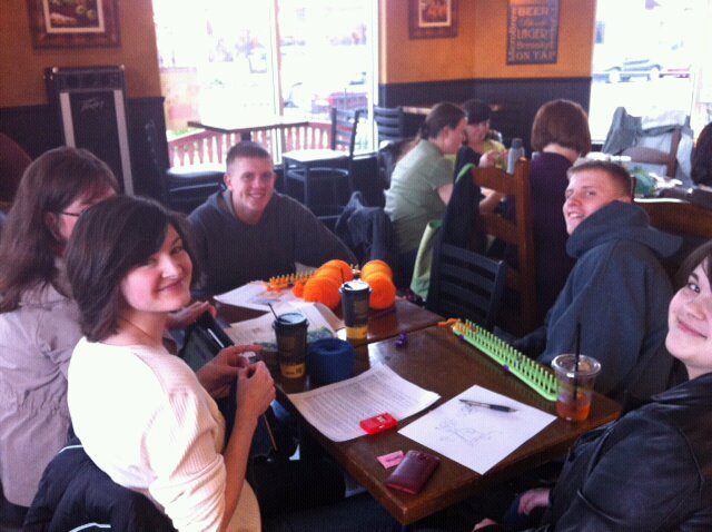At Knit Night…teaching teen guys how to make Half Fingered Gloves by Karen Gielen!
