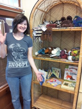 Emily’s luscious hand spun yarns, hand dyed fibers, and hand knit goodies are tucked up there along with my loom knitted goodies and my book, Loom Knitting for Little People. Pretty cool selection, if I do say so myself, lol! 😉