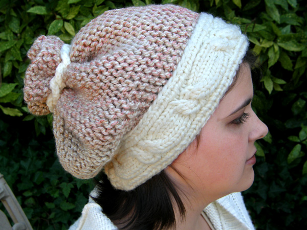 Cabled Katrina from the side…cute faux pom pom & twisted tie!