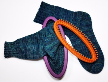 When using this loom for single knitting, the inner loom and its pedestals are removed so that you can have free access to let your knitting hang through the interior of the loom, as well as out the sides of the outer pedestals while working on the outer loom only. This outer loom has 52 pegs. Because the 2 looms are not connected, there would be no benefit to leaving the inner one in place (if you were thinking that a larger project could be made by using both loom’s pegs). Also, the inner loom’s pegs face toward the inside of the loom rather than the outside, so although you can technically loom from it as a stand alone loom, it might be a tad awkward with the pegs placed in that direction. 😉