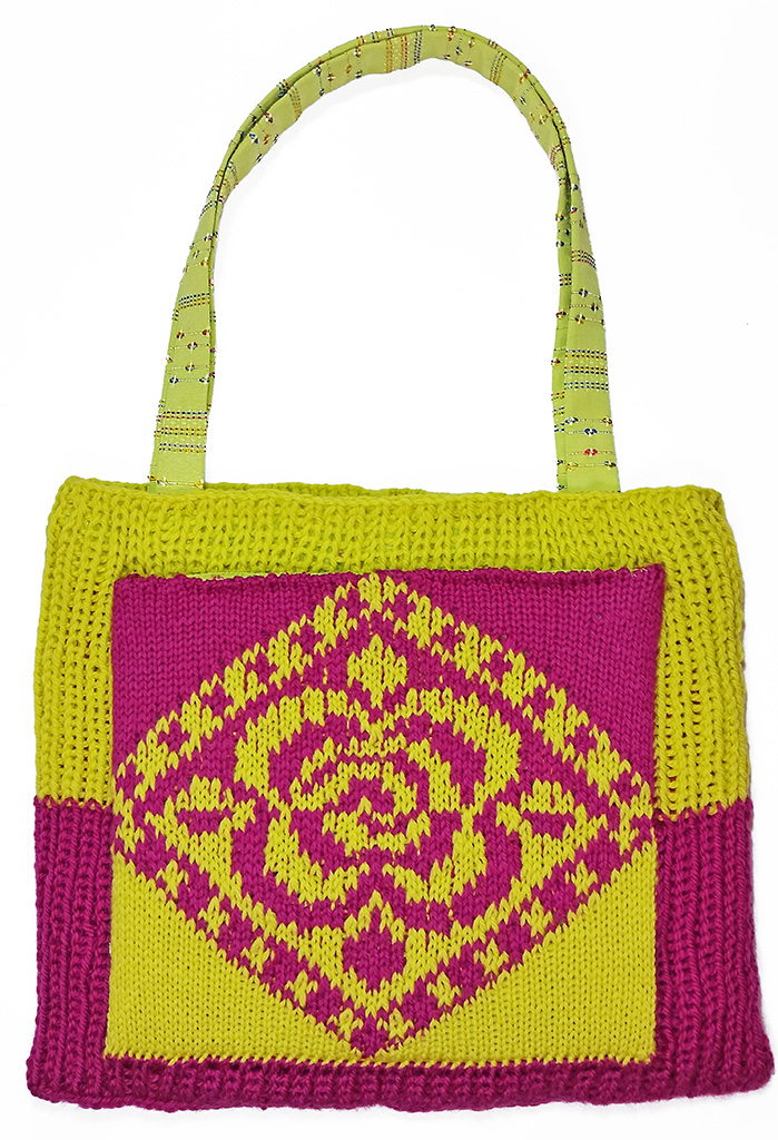This sweet little bag is such a snap to knit up on your regular to large gauge looms, that you’ll be sporting a new bag in no time! (Sample used yellow & blue round KK looms, but any loom of similiar gauge and peg # can be substituted. ) There is also a series of Video Tutorials based on the Decrease Bind Off here, that will make creating the rosette a snap!